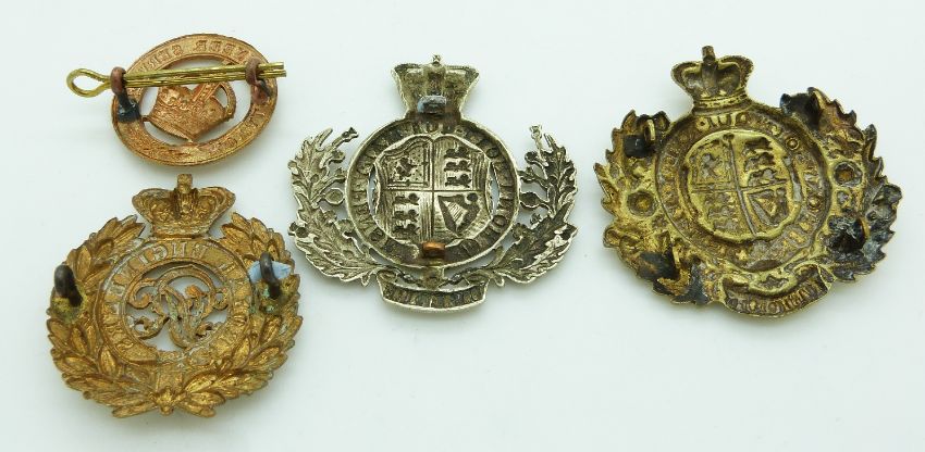 British Army Royal Engineers metal badges, three with Queen Victoria Crown together with Royal Engineers Services example