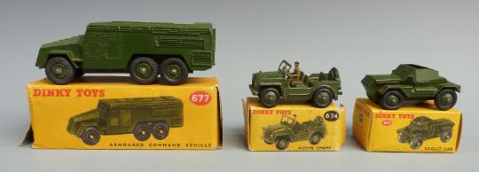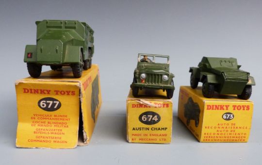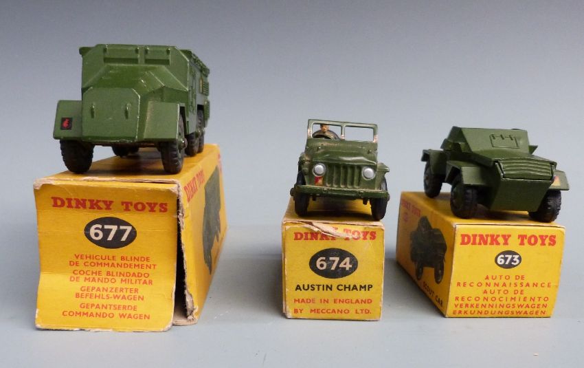 Three Dinky Toys diecast model military vehicles Scout Car 673, Austin Champ 674 and Armoured Command Vehicle 677, all in original boxes.