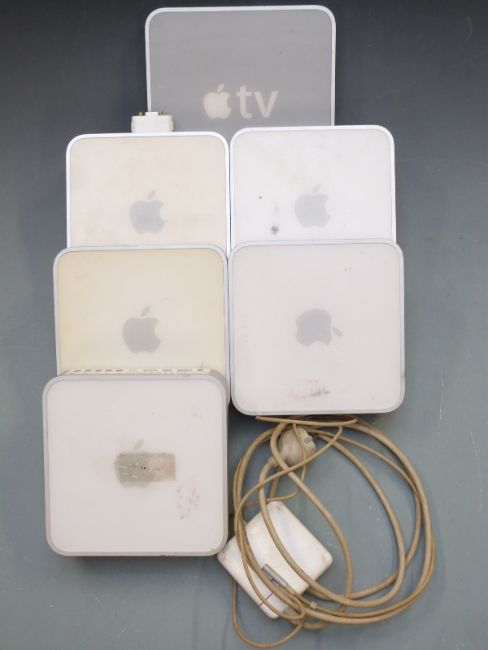 Five Apple Mac Mini computers together with an Apple TV A7278 unit and a Macbook charger.