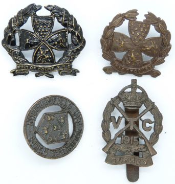 Four British Army Surrey Regiment, Inns of Court and Huddersfield Volunteers metal badges