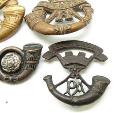 Nine British Army Light Infantry Regiments, Durham, Cornwall, Shropshire, Yorkshire and Somerset metal collar badges in three pairs plus three, one stamped Firmin and one J & Co