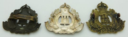 Three British Army Suffolk Regiment metal cap badges including a white metal example with Gaunt makers to reverse
