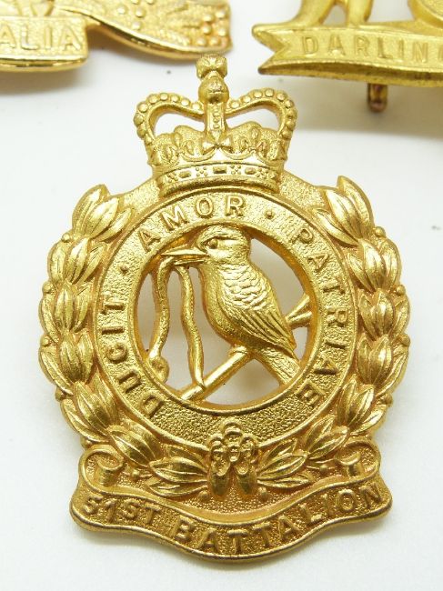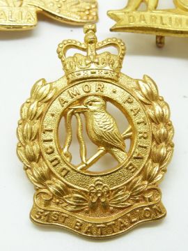 Five Australian Army 25th Regiment, 29th Regiment, 33rd Regiment and 51st Regiment metal hat badges together with an unnumbered example