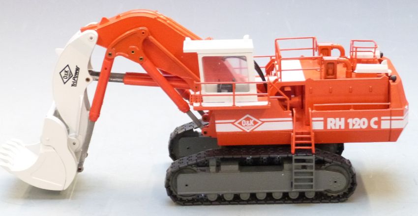 Conrad Models 1:50 scale diecast model Hydro-Raupenbagger RH 120 C excavator with red body, white arm and bucket and black rubber tracks, 2771, in original box.