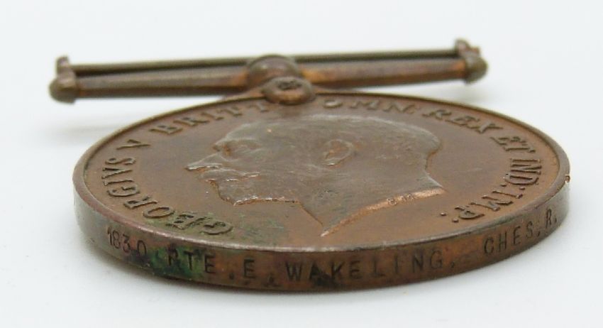British Army WWI and later medal trio comprising 1914-18 War Medal, Victory Medal and Territorial Force War Medal named to 1830 Pte E Wakeling, Cheshire Regiment, together with a Valcartier Camp 1914 medal and 1935 Jubilee medal