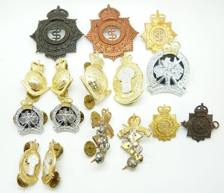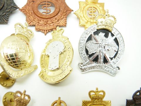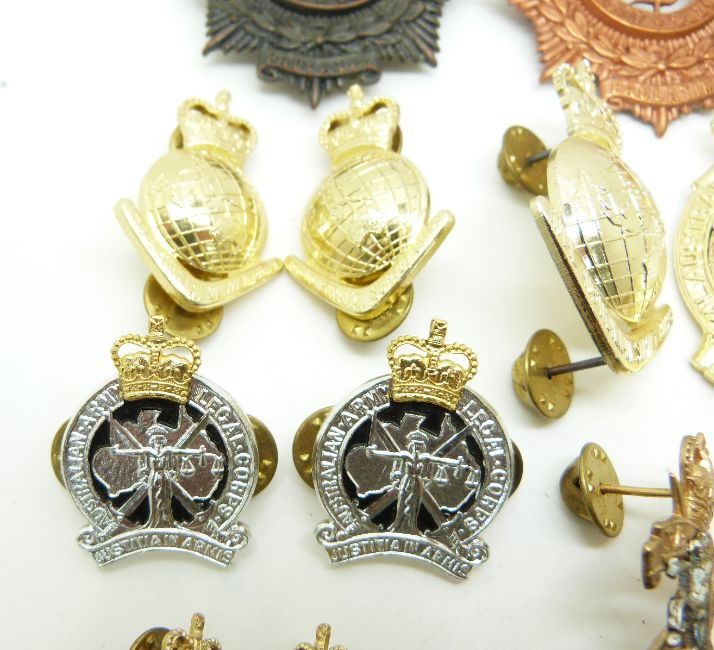 Seventeen Australian Army Corps hat and collar badges for the Legal, Pay, Survey and Medical Corps together with R E M E examples (some stamped Swann & Hudson)