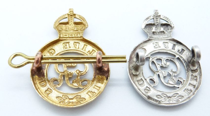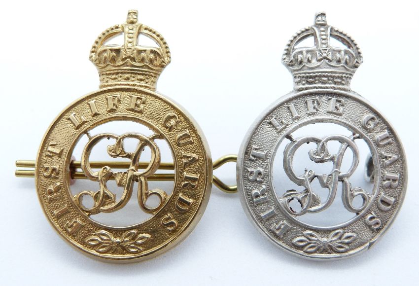 Two British Army First Life Guards metal cap badges, one marked silver to reverse