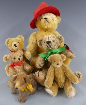Ten various Teddy bears including Hermann, Gabrielle Designs Paddington and Steiff style blonde mohair example with disc jointed limbs, cocked wrists and feet and humped back, largest 42cm tall.
