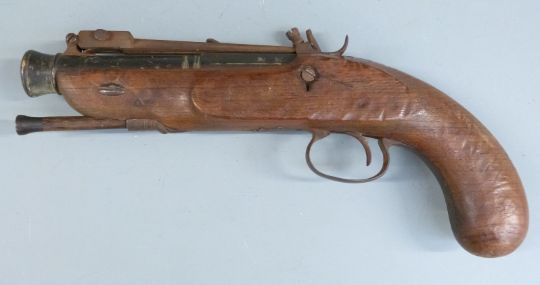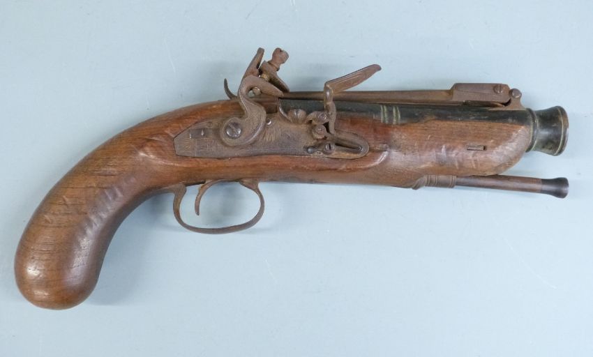Flintlock hammer action blunderbuss pistol with folding bayonet, engraved lock hammer and trigger guard, metal tipped wooden ram-rod, vacant wrist cartouche, and six inch multi-stage part octagonal barrel flared at the muzzle, overall length 30cm.