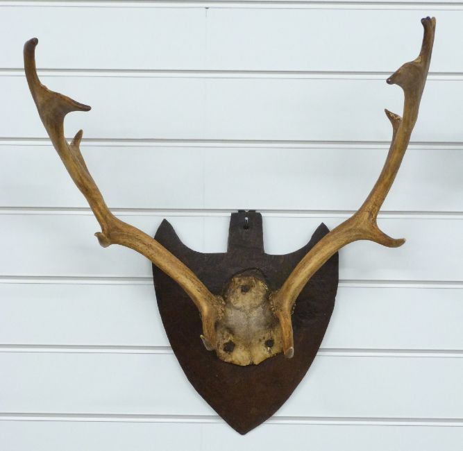 Two pairs of taxidermy stag antlers mounted on wooden shields, largest W55cm