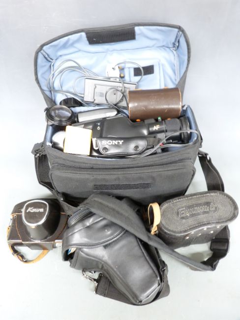 Sony Handycam video 8 CCD-F335E camera, Kowa SLR camera with further lenses, Praktica B100 SLR with Sigma 1:2 8-4 f=35 -70mm lens and a pair of Russian 8-30 binoculars