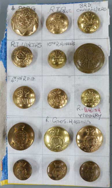 Approximately one hundred British Army buttons for Infantry and Cavalry Regiments including Light Infantry, Guards Brigade, Fusiliers, a set of Queen Victoria's Rifles 9th London Regiment with shoulder titles, Royal Gloucestershire Hussars, 10th Hussars, 4th/7th Dragoons, 21st Lancers etc