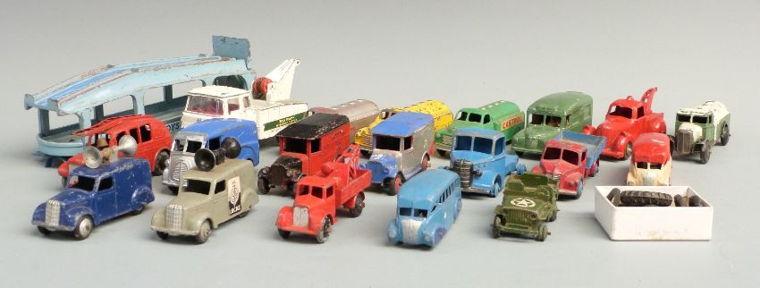Eighteen Dinky Toys diecast model commercial vehicles including loudspeaker cars, tankers, Dinky Toys Delivery Service Pullmore Car Transporter, fire engines, recovery trucks etc.