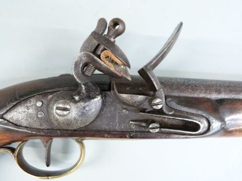 Flintlock hammer action sea service pistol with brass butt plate, trigger guard and mounts, belt loop and 9 inch smooth bored barrel, overall length 40cm.