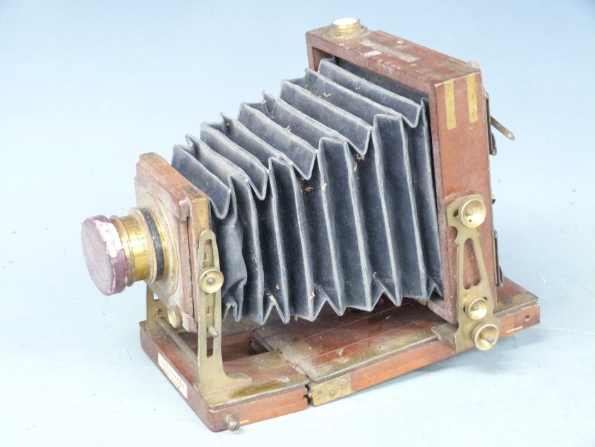 J. Lancaster & Son, Birmingham mahogany plate camera, with Taylor Taylor and Hobson Cooke 4 1/4 x 3 1/4 lens, and a quantity of film holders