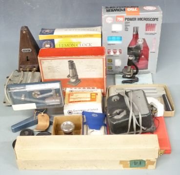 Various scientific interest items to include hydrometers, vintage microscope kit, further boxed microscope, Cochranes of Oxford molecular model, cased scales etc
