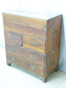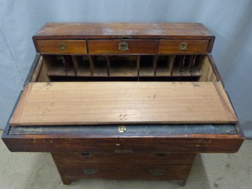 19thC brass bound campaign secretaire chest with two over three graduated drawers, below brass inlay detail, raised on bracket feet with castors, 107 x 90 x 47cm.