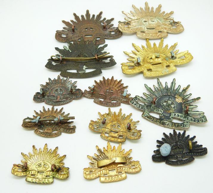 Twelve Australian Army generic 'Rising Sun' badges for the Military Forces and Commonwealth Forces comprising five hat badges and seven collar badges