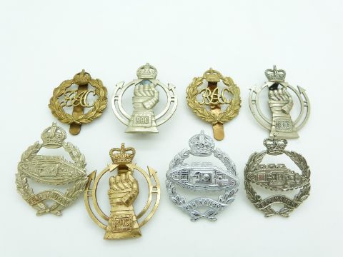 Eight British Army Royal Armoured Corps and Royal Tank Regiment metal badges