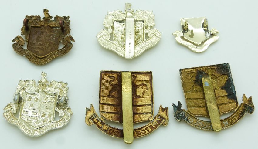 Six Tonbridge School Officer Training Corps and Taunton School Officer Training Corps metal and anodised badges, one by Dowler