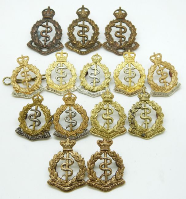 Fourteen British Army Royal Army Medical Corps metal collar badges