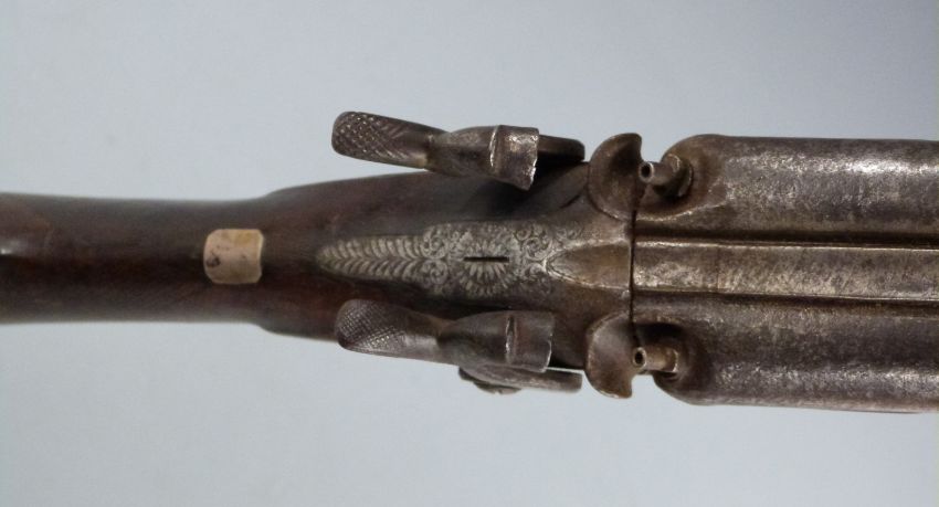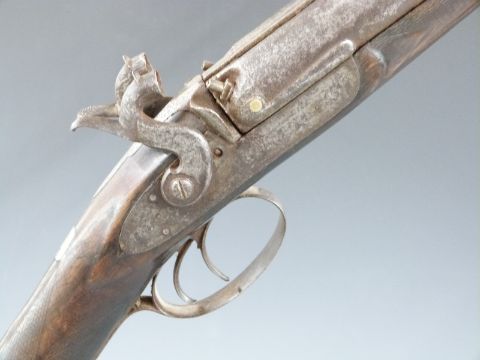 J Hill side by side double barelled hammer action gun with named and engraved lock, engraved hammers, top plate, trigger guard and mounts, chequered grip and forend, vacant wrist cartouche, brass tipped wooden ram-rod, double trigger and 29 inch Damascus barrels, overall length 115cm.