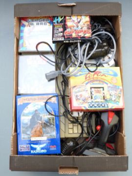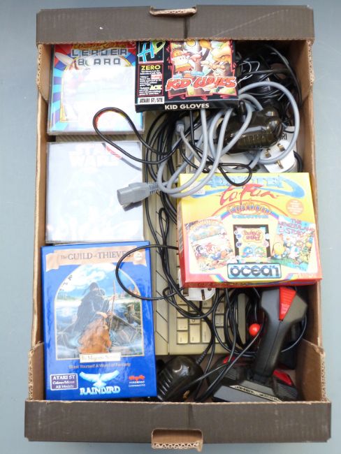 Atari 520ST video games console together with various accessories including joysticks, The Bug etc and 39 various games including Star Trek, Blood, Swap, Pipe Mania, Armour-Geddon etc, most in original boxes.