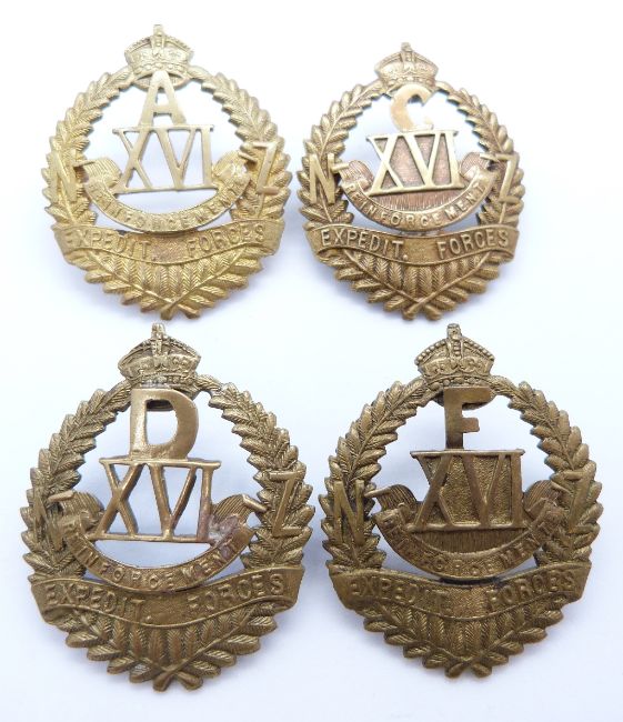 Four New Zealand Army WWI 16th Reinforcements A, C, D and F Company metal hat badges