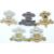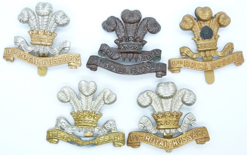 Five British Army 10th Royal Hussars metal cap badges including officer's service dress and an all brass example