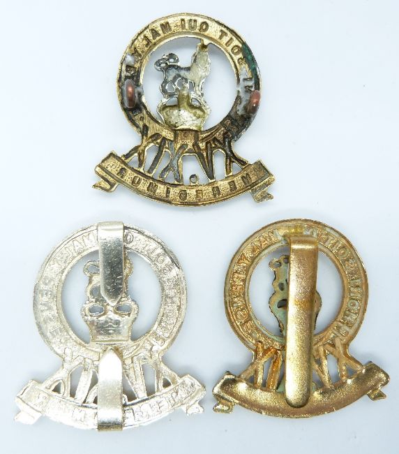 Three British Army 15th/19th Hussars metal cap badges including an other ranks bi-metal example