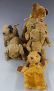 Seven various Teddy bears including a Sooty hand puppet and two dogs, largest 47cm tall.