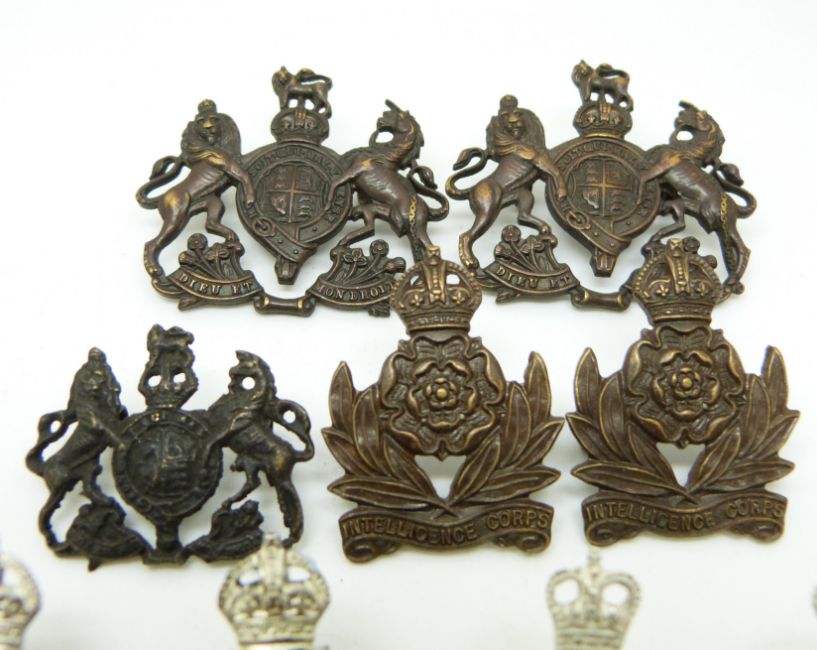 Fifteen British Army Intelligence and General Service Corps metal collar badges in six pairs plus three, one pair stamped J.R.Gaunt