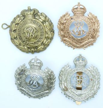 Four British Army Royal Engineers Volunteers metal badges including a Queen Victoria cipher example