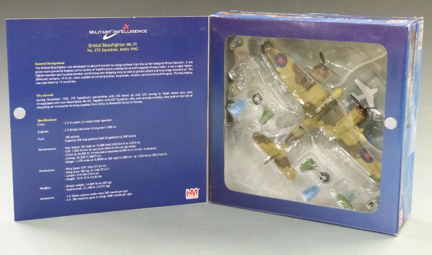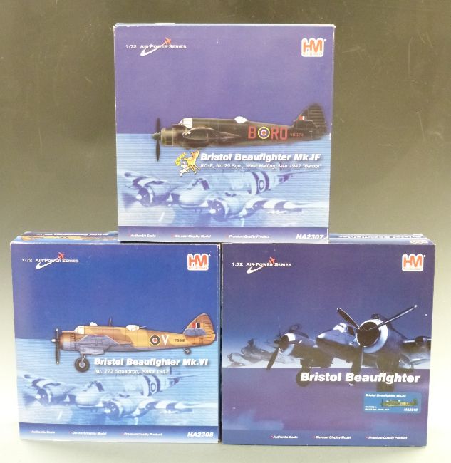 Three Hobby Master 1:72 scale diecast model aeroplanes Bristol Beaufighter Mk.IC HA2315, Bristol Beaufighter Mk.VI HA2308 and Bristol Beaufighter Mk.IF HA2307, all in original boxes.