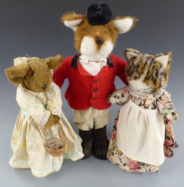 Three large Teddy bears with heavy weighted bases, one in the form of a fox 57cm tall.