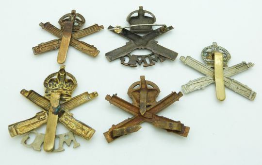 Five British Army Machine Gun Corps and Motor Machine Gun metal cap badges including two officer's examples, one marked for Gaunt