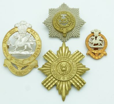 Four British Army Queen's Division, Cheshire Regiment and Scots Guards metal badges, one by Gaunt