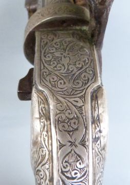 Middle Eastern flintlock hammer action double barrelled over and under pistol with all over embossed and engraved white metal decoration, suspension loop to butt and six inch hand rotated barrels, overall length 29.5cm.