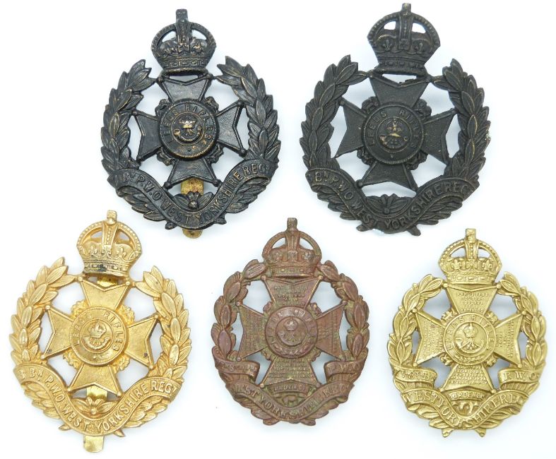 Five British Army West Yorkshire Regiment 7th/8th Battalion Leeds Rifles metal badges