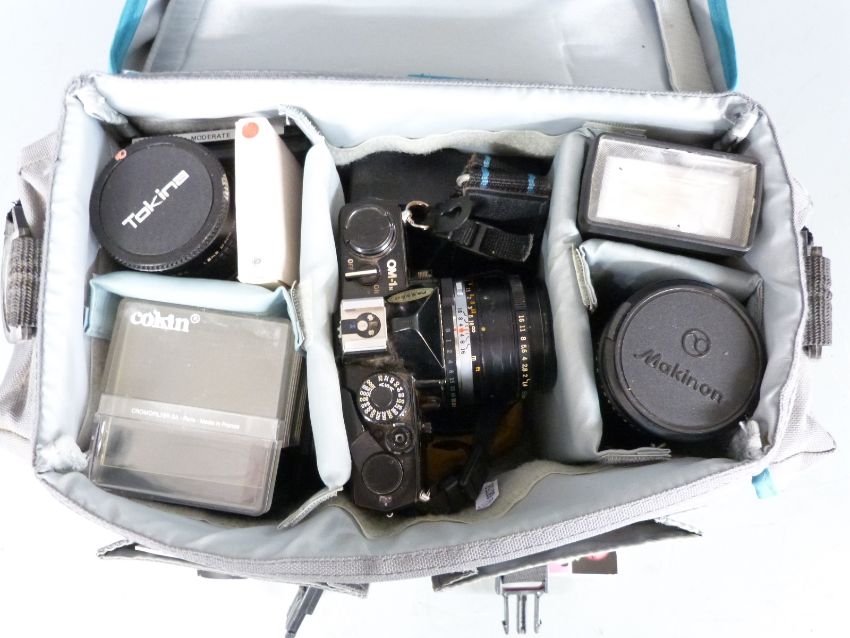 Olympus OM-1 N SLR camera with Olympus 50mm 1:1.4, Zeiss f=2.8 1:2.8 and Makinon 1:4.5 f=80-200mm lenses, Tokina doubler, various filters, manuals etc