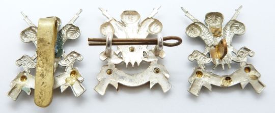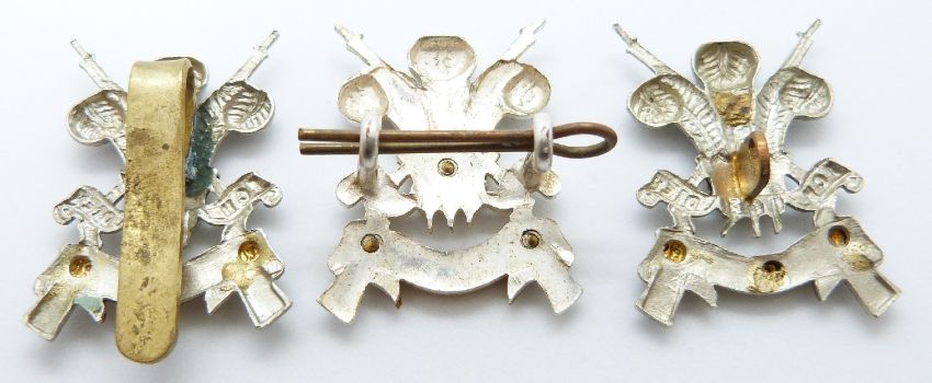 Three British Army 3rd Carabiniers metal cap badges including one officer's