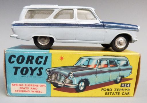 Corgi Toys diecast model Ford Zephyr Estate Car with two-tone blue body and lemon interior, 424, in original box.