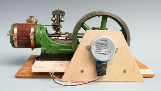 Stuart Turner No 9 live steam horizontal stationary engine with fly ball governor, on wooden display base, 33cm long.