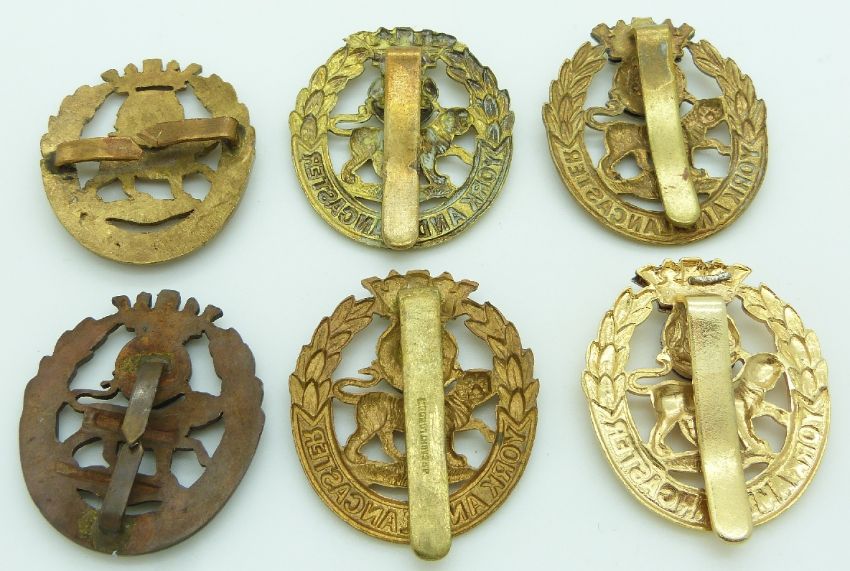 Six British Army York and Lancaster Regiment metal cap badges including an all brass and officer's example