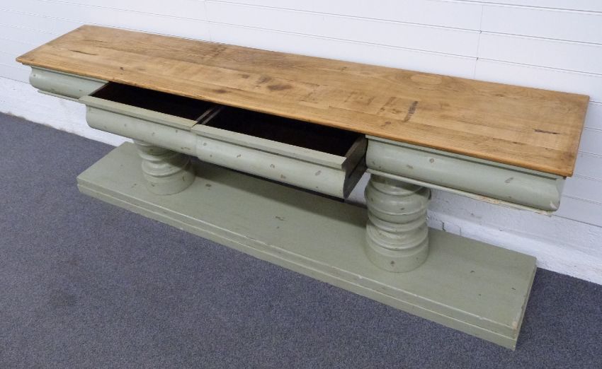 Large painted sidetable or leaflet with two drawers, raised on turned supports, L240 x D45 x H84cm