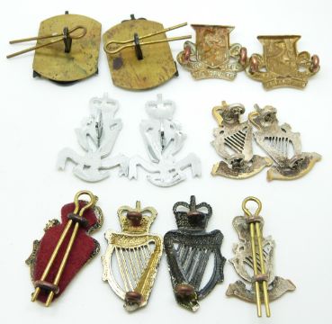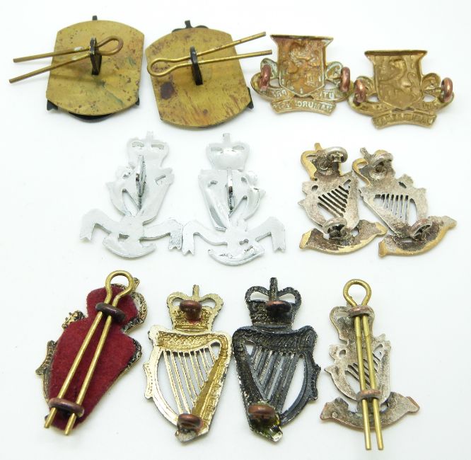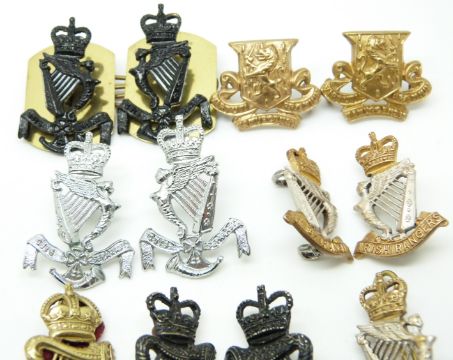 Twelve British Army Irish Rangers, Royal Irish Regiment etc metal collar badges in five pairs plus two