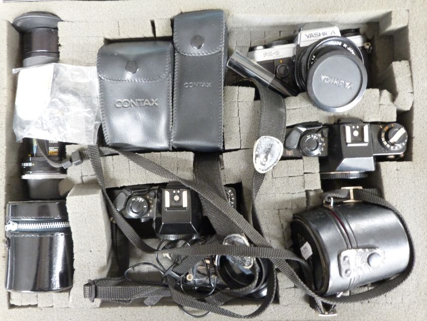 Contax and Yashica cameras, lenses and accessories to include two Contax 139 Quartz SLR bodies, Yashica FX-D with 50mm 1:2 lens, Tamron 1:3.8 80-210mm and 1:2.5 28mm lenses, Panagor macro converter, Contax 139 winder and flash unit etc