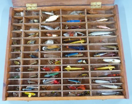 Vintage fishing lures and trout fishing flies in two cases including a hinged 'Plucky' lure, painted wooden lures, 'Sprey' toby, Mepps spoons etc together with two framed photographs 'Dunford Mill' and a 6lb trout