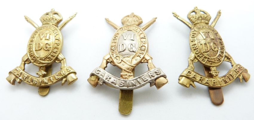 Three British Army 6th Dragoon Guards metal cap badges including an all brass example