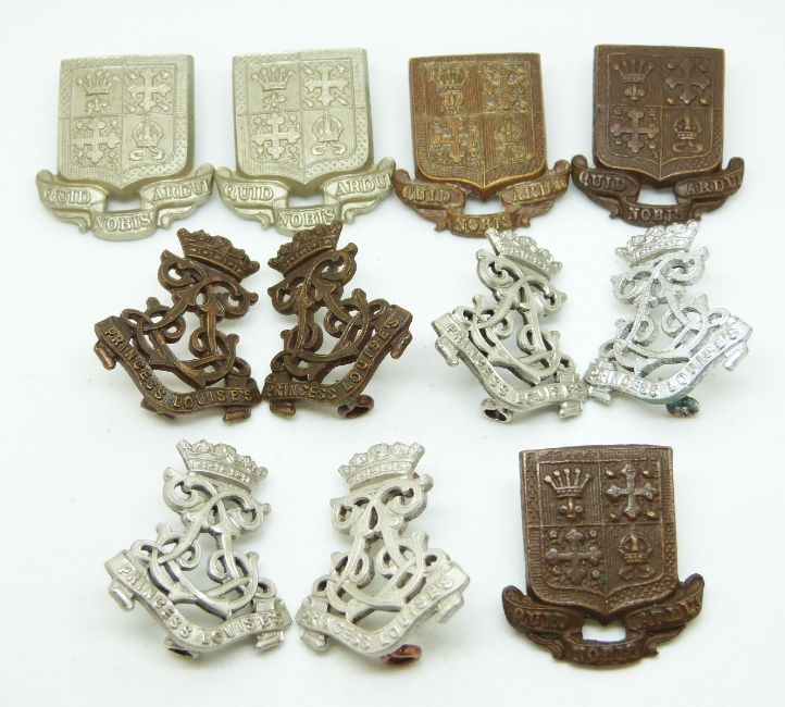 Eleven British Army Kensington Regiment (Princess Louise's) metal collar badges in five pairs plus one